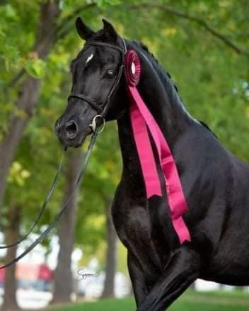 15.3h Homozygous Black Straight Egyptian Stallion. Sweepstakes Nominated, CA, LF, clear. 2020 Sport Horse National Top Ten Dressage Type Sport Horse Under Saddle ATR. Full brother to both Maria Halima and Trubadors Madrigal+. He is Gradin Arabian’s successor to Haziz Halim where he has been quietly siring beautiful black foals many of which have been exported. We are excited to welcome this great moving, big, beautiful boy to Madrigal Farms where we can share him with a larger audience. Jaziz Halim offers the size, disposition, and tractability this line is known for with the magical black color.