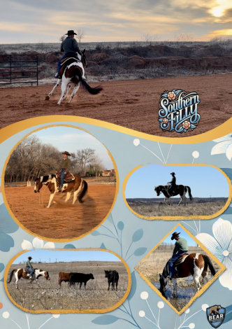 15hands/Substantial build Southern Filly is a beautiful, sweet, and lovable 5-year old mare with a good mind. She has been trained in a foundation for Reining/Ranch Riding and Ranch Trail. She can respond to a rider’s seat while on a loose rein, changing gaits or stopping based on seat cues. Southern Filly is push-style and not hot-blooded which is great for western performance events or trail riding. She stands calmly for mounting from either side using a mounting block or fence rail, and is trained to wait for the rider’s cue to walk off. Outside the arena, Southern Filly continues to listen to the rider’s seat and cues. She can be ridden alone—away from the barn or other horses—without trying to hurry back home. She has also been hauled off the property a few times and trail ridden with some exposure to light car traffic. For more information and questions about her please don’t hesitate to contact us! 405-439-0322